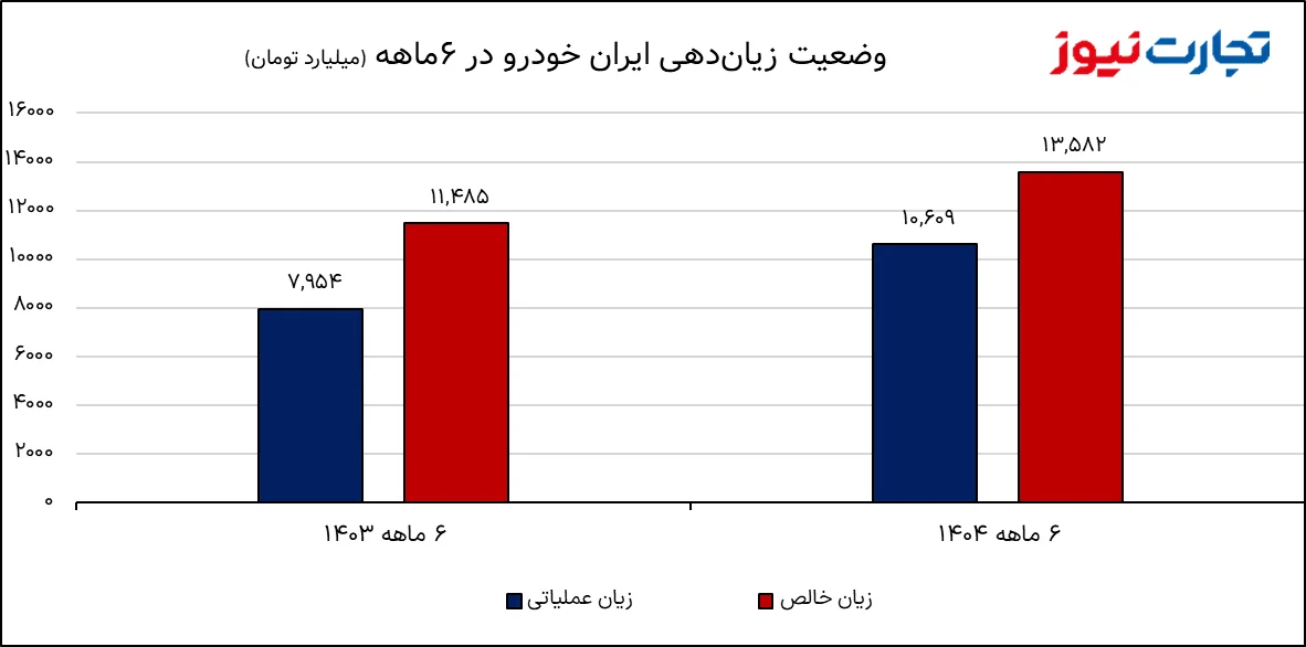 برآیند عملکرد ایرانخودرو در نیمه نخست ۱۴۰۴ زیان خالص ۱۳ هزار و ۵۸۲ میلیارد تومانی است؛ در حالیکه در مدت مشابه سال گذشته زیان خالص ۱۱ هزار و ۴۸۵ میلیارد تومان گزارش شده بود. به عبارت دیگر، زیان شرکت ۱۸ درصد بیشتر شده است. این در حالی است که زیان عملیاتی شرکت نیز از هفت هزار و ۹۵۴ میلیارد تومان به ۱۰ هزار و ۶۰۹ میلیارد تومان رسیده و ۳۳ درصد بیشتر شده است.