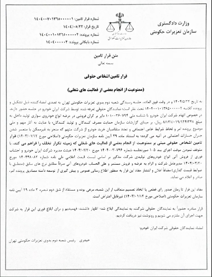 این قرار اجرای بند ۱۵ صورتجلسه هیات‌مدیره ایران ‌خودرو در ۲۰ خرداد را ممنوع و فروش آتی خودروها را با قیمت‌های جدید متوقف کرد. بر این اساس، ایران خودرو موظف شد عرضه خودروها را با نرخ‌های پیشین و مطابق ضوابط قانونی ادامه دهد و مفاد قرار را به صورت عمومی اطلاع‌رسانی کند تا از گسترش تخلف جلوگیری شود. این قرار تا صدور رای قطعی یا تصمیم بعدی شعبه معتبر می‌ماند و غیرقابل اعتراض است.